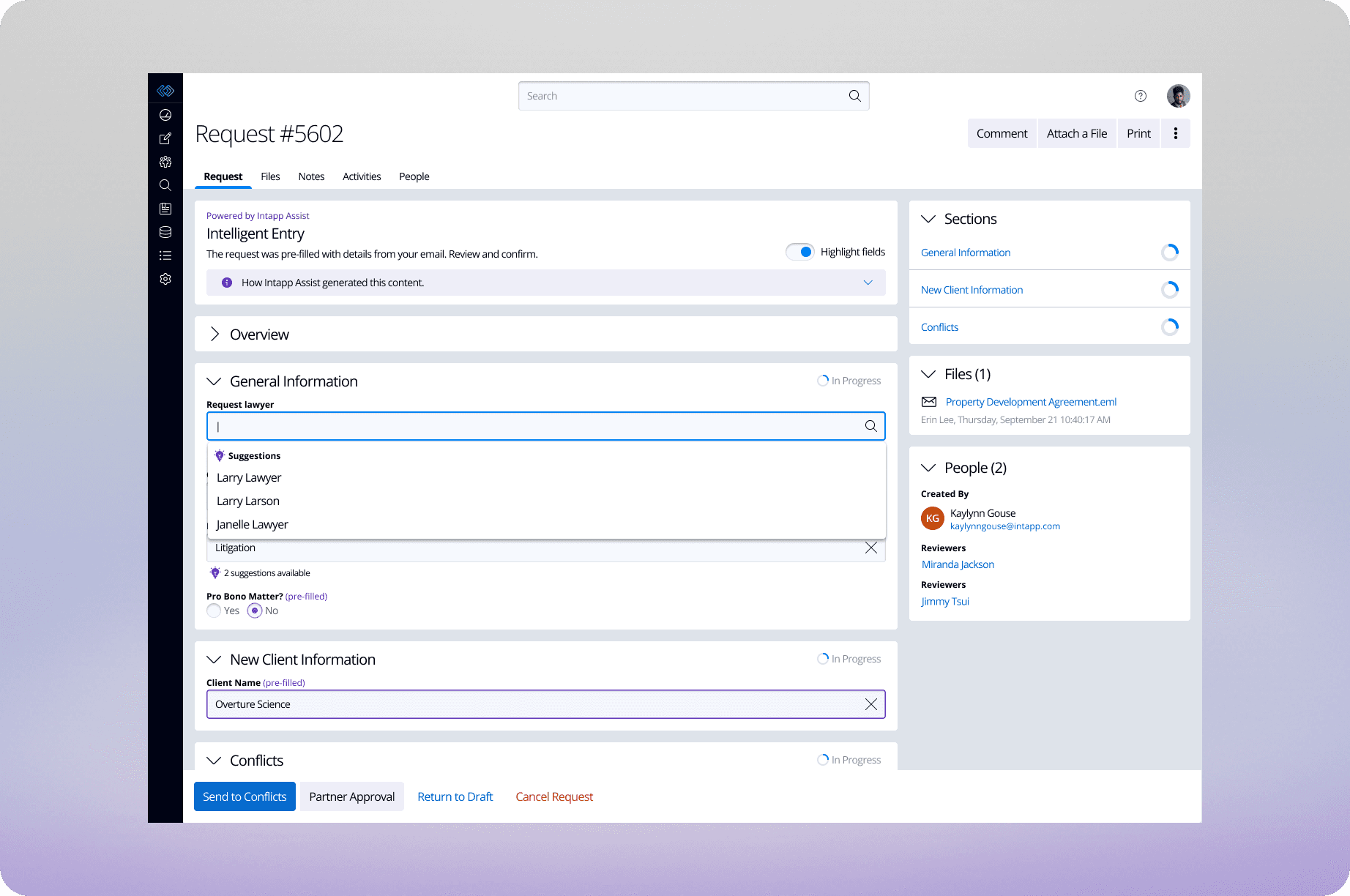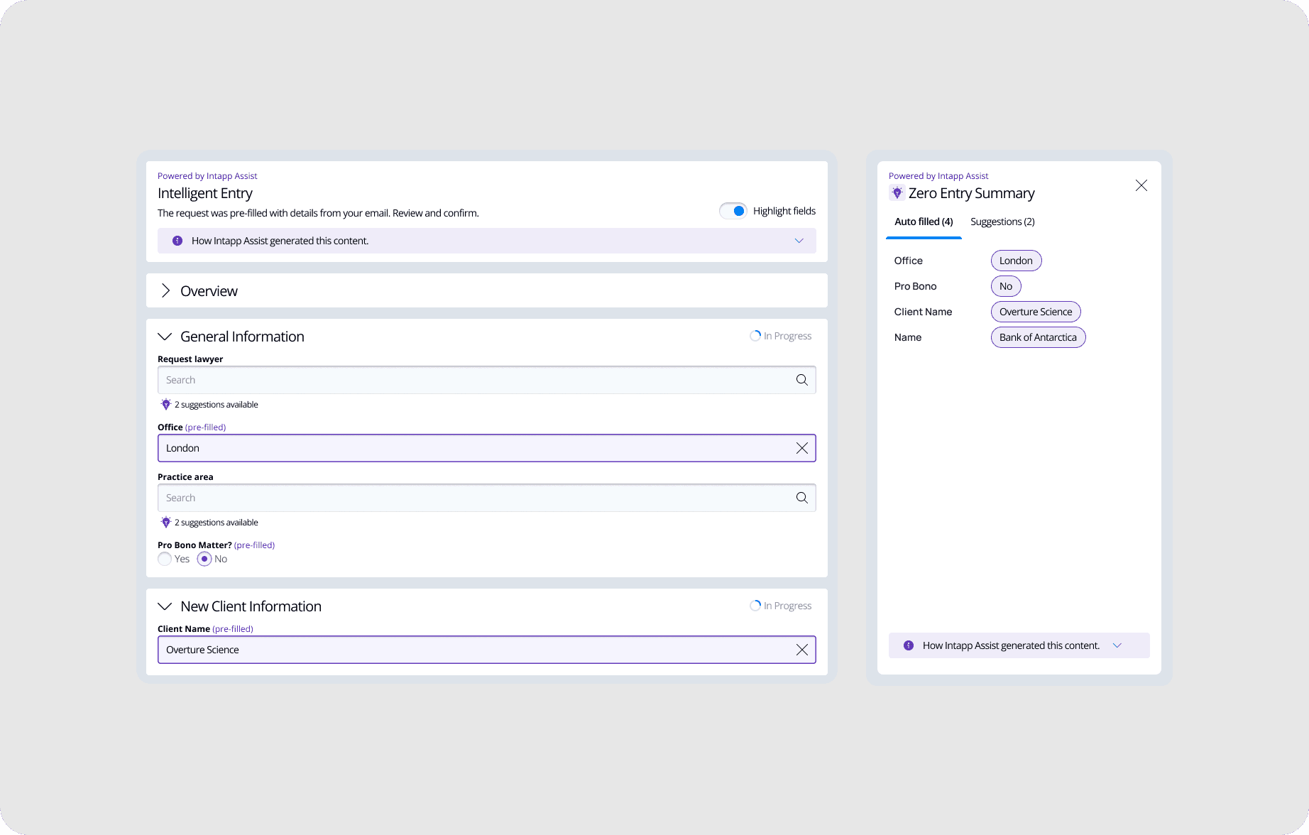 At Intapp, I led the design of an AI-assisted intake form that prepopulates key fields from user context and email content, reducing manual data entry while keeping users in full control through inline review and editing.