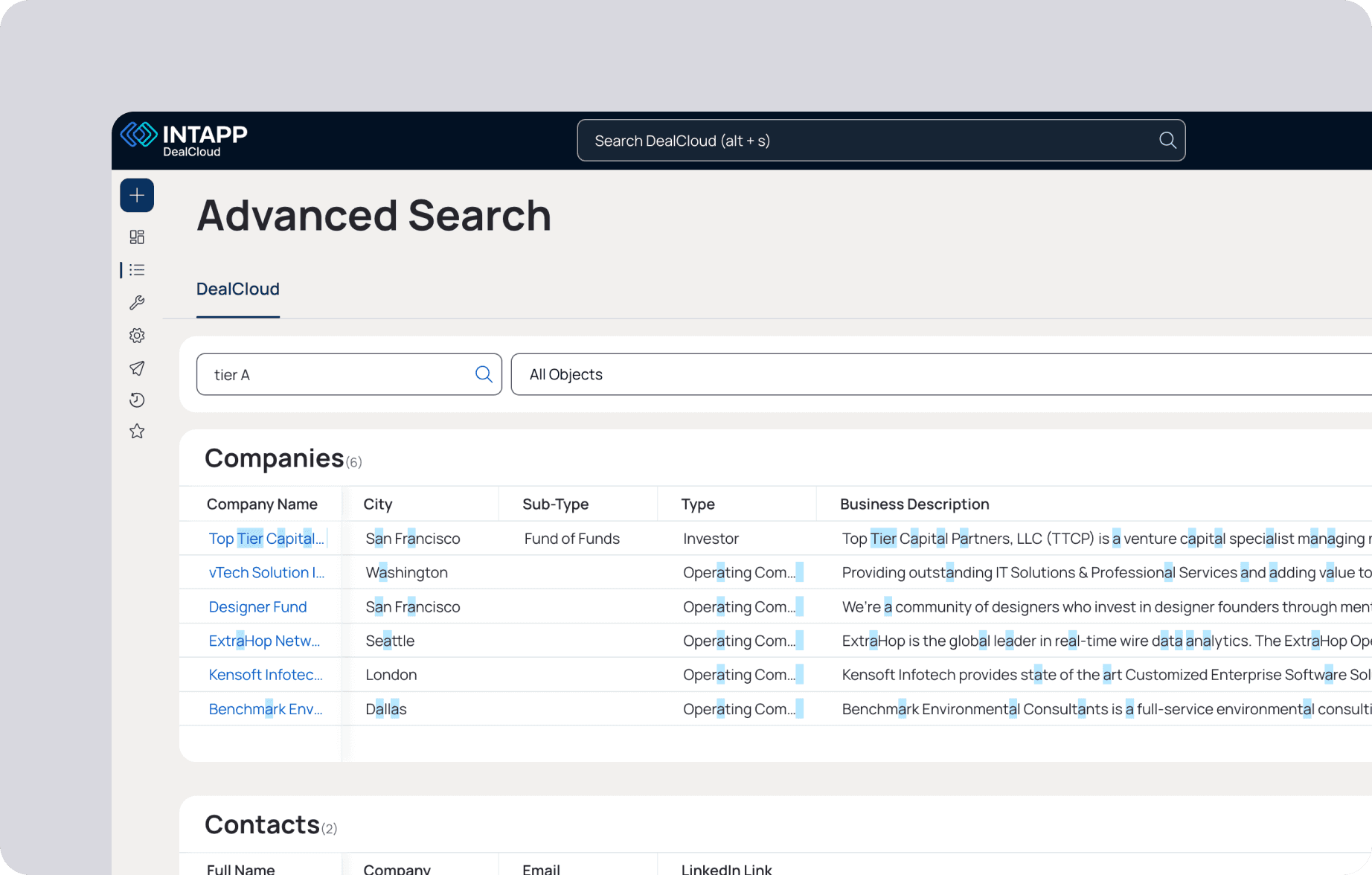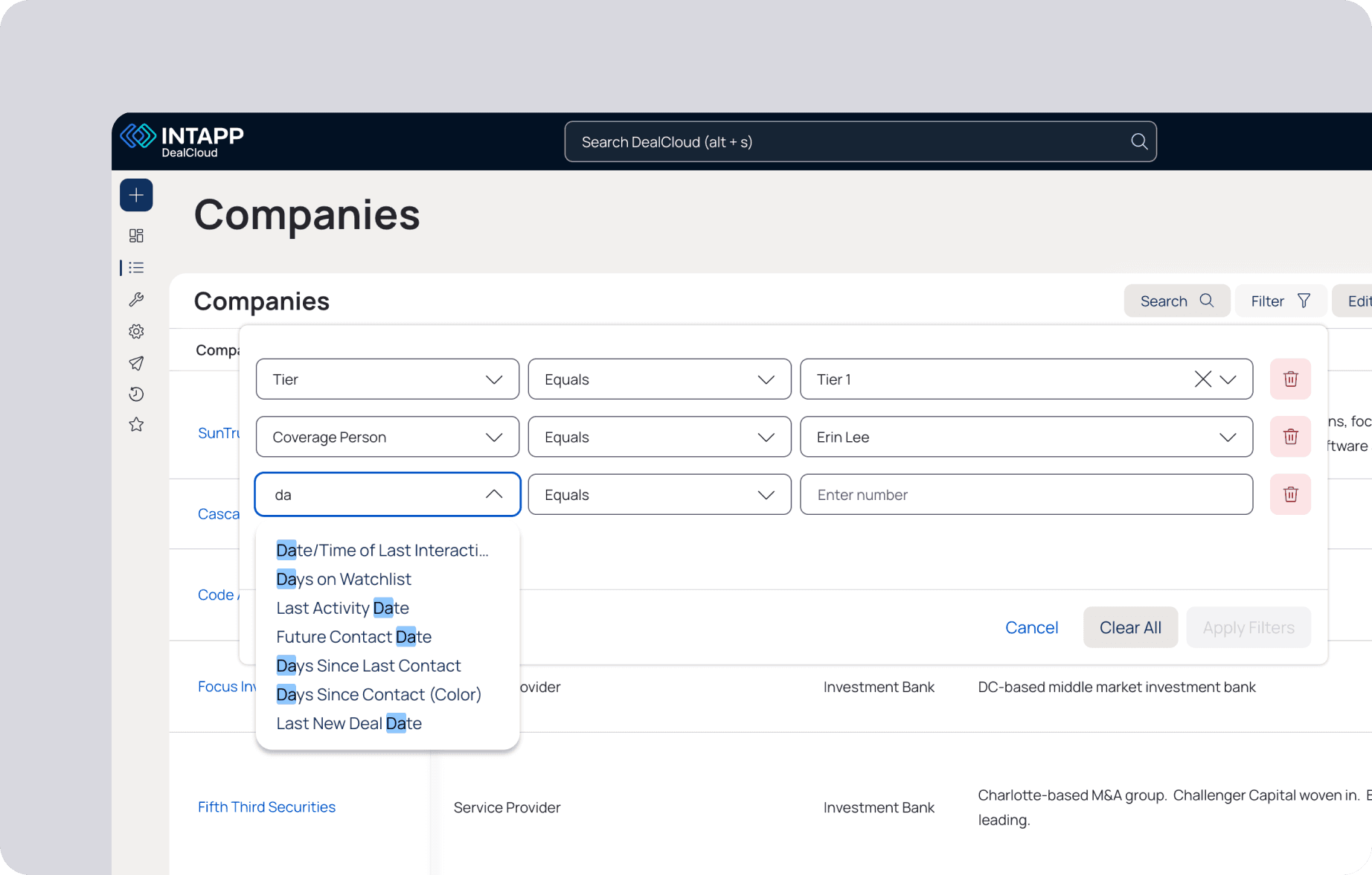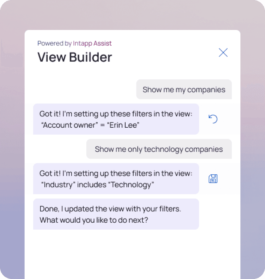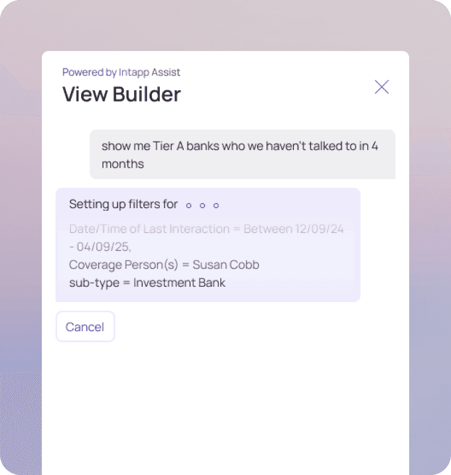 At Intapp, I led the design of Natural Language Filter that helps users filter CRM data using conversational input, rather than manually building filters with exact field names or complex logic.