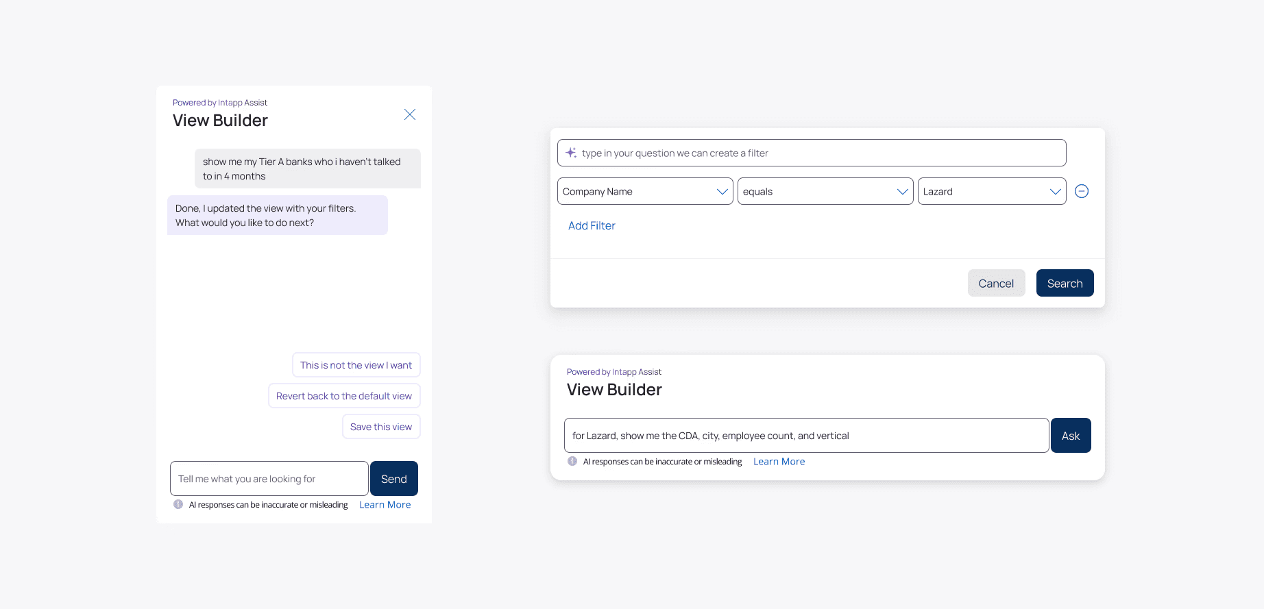 We explored multiple approaches and chose the integrated view-builder because it best enables effortless data discovery without requiring knowledge of field names or structure. The assistant overlay limited iteration, and the structured builder still assumed schema familiarity. The integrated experience converts natural language into editable filter tokens in context, reducing friction while preserving enterprise-grade transparency and control.